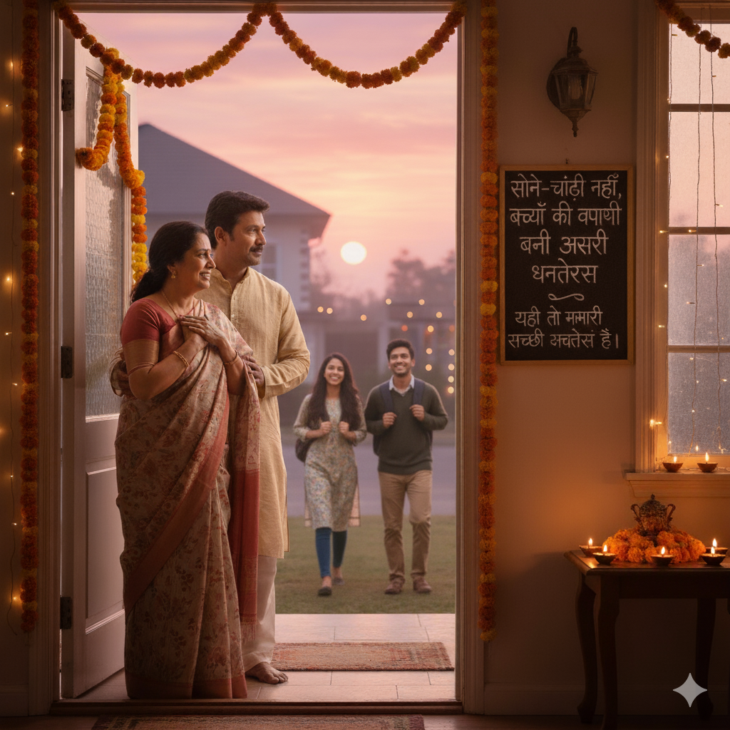 सुबह जैसे ही दरवाज़े पर दस्तक हुई, दोनों बच्चे मुस्कुराते हुए भीतर आए। वह दृश्य किसी स्वर्णाभूषण से अधिक चमकदार था। आँखों में नमी थी, होंठों पर मुस्कान — और दिल में बस एक ही भाव, “यही तो हमारी सच्ची धनतेरस है।” उस क्षण लगा, वर्षों की थकान मिट गई हो।